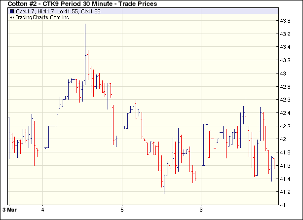 3月6日,外圍市場再度企穩(wěn),股市和原油上漲,帶動期棉早盤大幅上揚,但獲利平倉盤打壓期棉回落,盤終3月和5月合約微弱收漲,其它合約跌勢不一。當日紐約期棉小幅高開,美元走弱,兼原油反彈推動期棉快速上揚,空頭回補,5月合約最高上漲至42.62美分/磅,但是高位獲利平倉壓力呈現(xiàn),促使期棉震蕩回落,盤終主力5月合約微漲5點收于41.43美分/磅。 紐約棉花期貨主力0905合約近三個交易日交易走勢 |