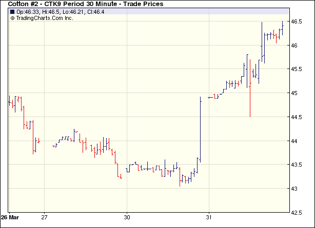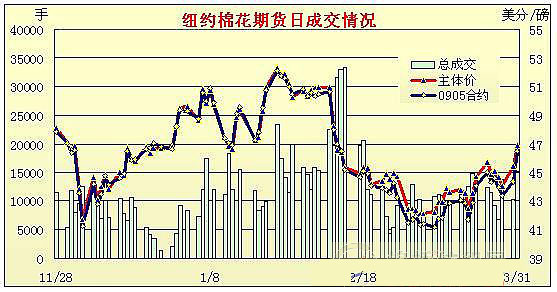3月31日紐約期棉受外圍谷物市場影響,在買盤強勁支持下大幅收漲,同時當日成交量達7周以來最高點。當日期棉市場小幅高開,在買盤支持下震蕩走高。盤中USDA公布下年度美棉種植面積預測為881.15萬畝,較上年度減少7%,減少幅度低于市場普遍預期,因此棉市賣盤發(fā)起進攻,對價格形成打壓。然而受外圍谷物走強的影響,期棉買盤很快再次興起,助價格大幅反彈并收高。5月合約盤中最高至46.50美分/磅,收于46.47美分/磅,漲208點;其它合約漲幅為147-196點。 紐約棉花期貨首期0905合約近三個交易日交易走勢 |