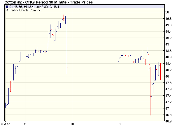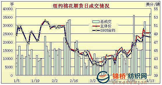 復(fù)活節(jié)過后紐約期棉成交縮量,除近期5月合約小幅收跌外,其它合約均小幅收漲。當(dāng)日棉市開盤后小幅震蕩走高,5月合約最高至48.91美分/磅,較開盤高70點。美國股市開盤后,帶動原油及玉米期貨走弱,同時期棉受壓加之買盤衰落引發(fā)價格下滑,5月合約最低至46.75美分/磅。尾盤時買盤再度興起,使價格低點反彈,收復(fù)跌幅;當(dāng)日僅近期5月合約小幅收跌,其它合約小幅收漲。5月合約跌26點,收于48.15美分/磅;7月合約漲25點,收于48.98美分/磅。 紐約棉花期貨首期0905合約近三個交易日交易走勢 |