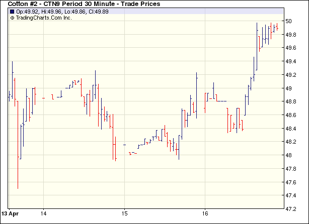3月16日外圍大豆市場(chǎng)走強(qiáng)、美棉出口周報(bào)利好,紐約期棉受買(mǎi)盤(pán)支持,在收漲百余點(diǎn)的基礎(chǔ)上再度中幅上漲。當(dāng)日市場(chǎng)平開(kāi)低走,早盤(pán)出現(xiàn)獲利回吐盤(pán)打壓,期棉價(jià)格一度走低,5月合約最低至47.54美分/磅。后賣(mài)盤(pán)減少,空頭回補(bǔ)盤(pán)及投機(jī)買(mǎi)盤(pán)興起,期棉從低點(diǎn)反彈,5月合約最高值49.45美分/磅。當(dāng)日大部分合約中幅收漲,5月合約漲幅最大,為98點(diǎn),收于49.31美分/磅,為9周來(lái)高點(diǎn);7月合約漲81點(diǎn),收于49.91美分/磅。4.3-4.9一周美國(guó)凈簽約出口本年度陸地棉66315噸,較前一周增加15%;裝運(yùn)52231噸,較前周減20%。另簽約出口09/10年度陸地棉27079噸。16日CBOT5月大豆收高23.5美分至1058.5美分/蒲式耳,為6個(gè)月來(lái)高位。 紐約棉花期貨主力0907合約近三個(gè)交易日交易走勢(shì) |