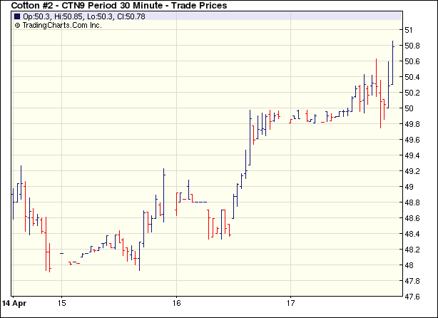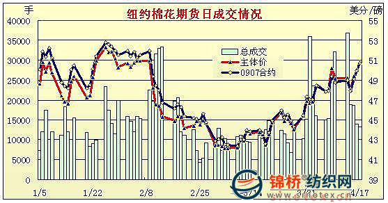 4月17日期棉成交縮量,在投機買盤支持下再次中幅收高,形成三連陽。當日市場微幅低開,雖外圍大豆等谷物市場走弱,但由于賣盤清淡,投機買盤活躍,棉市震蕩走高。接近尾盤時部分獲利回吐盤致棉價下跌,但很快新一輪買盤興起,使價格很快反彈并攀至當日高點,近期5月合約最高至50.14美分/磅;7月合約最高至50.85美分/磅。盤終各合約中幅收高,5月合約漲63點,收于49.94美分/磅;7月合約漲78點,收于50.69美分/磅,為11周來高點。近日來期棉連續(xù)上漲可能受美棉出口及需求利好的影響,但目前市場中有超買現象,下周棉市有可能走弱,因為從基本面來看,本年度仍有大量庫存,同時美棉播種面積處于市場預期的上游水平。 紐約棉花期貨主力0907合約近三個交易日交易走勢 |