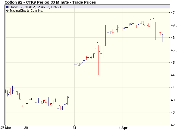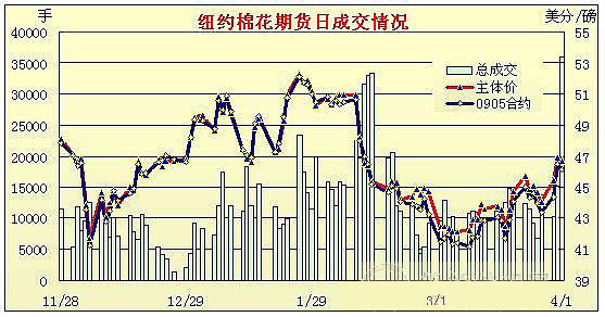 4月1日受外圍谷物市場拖拽及獲利回吐盤打壓紐約期棉小幅收跌。當(dāng)日期棉市場小幅低開,窄幅震蕩,午盤前5月合約最高至46.78美分/磅。午盤后由于外圍谷物市場賣盤興起,加之獲利回吐盤的打壓,期棉中幅回落,5月合約最低至45.81美分/磅,收盤前在少量買盤支持下收復(fù)部分跌幅,盤終各合約小幅收跌。5月合約跌32點(diǎn),收于46.15美分/磅;7月合約跌29點(diǎn),收于47.06美分/磅。 紐約棉花期貨首期0905合約近三個(gè)交易日交易走勢(shì)