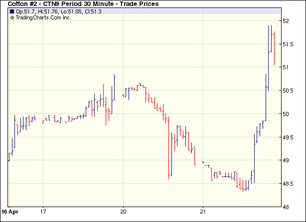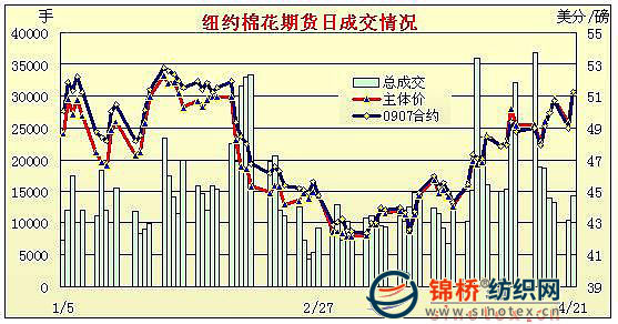4月21日,美國(guó)股市大幅上揚(yáng)以及外圍谷物市場(chǎng)走強(qiáng)為期棉帶來(lái)支撐,在買(mǎi)盤(pán)的支持下紐約期棉前4個(gè)合約大漲200余點(diǎn),市場(chǎng)收回前一日跌幅。當(dāng)日棉市開(kāi)盤(pán)后小幅震蕩,午盤(pán)前中幅走低,5月合約最低至47.09美分/磅,7月合約最低至48.33美分/磅。在外圍市場(chǎng)的帶動(dòng)下,期棉買(mǎi)盤(pán)發(fā)力,價(jià)格迅速攀高并觸發(fā)止損買(mǎi)盤(pán),進(jìn)一步助漲價(jià)格,5月合約最高值50.47美分/磅,7月合約最高值51.89美分/磅。尾盤(pán)時(shí)漲幅小有回落,各合約大幅收漲,前4個(gè)合約漲幅均在200點(diǎn)以上,其它合約漲幅為161-193點(diǎn)不等。5月合約漲204點(diǎn),收于49.83美分/磅,為12周高點(diǎn);7月合約漲230點(diǎn),收于51.30美分/磅。 紐約棉花期貨主力0907合約近三個(gè)交易日交易走勢(shì) |