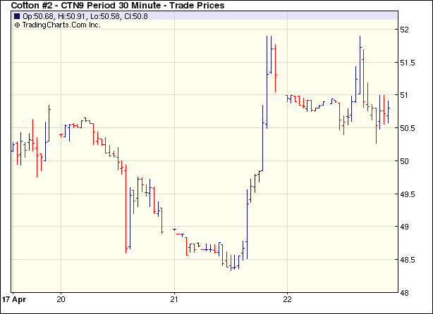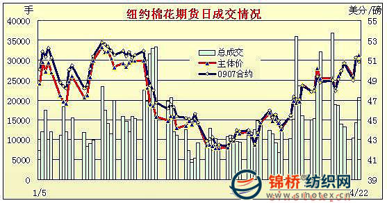 22日紐約期棉受獲利回吐盤打壓各合約小幅下跌。由于前一日期棉大漲,昨日市場開盤后受獲利回吐盤打壓,價(jià)格下跌,5月合約最低至48.40美分/磅,7月合約最低至50.27美分/磅。午盤后投機(jī)買盤進(jìn)入市場,拉高價(jià)格,5月合約最高至49.95美分/磅,7月合約最高值51.89美分/磅。尾盤時(shí)賣盤再度興起,期棉價(jià)格回落并小幅收跌。5月合約跌54點(diǎn),收于49.29美分/磅;7月合約跌51點(diǎn),收于50.79美分/磅。 紐約棉花期貨主力0907合約近三個(gè)交易日交易走勢(shì) |