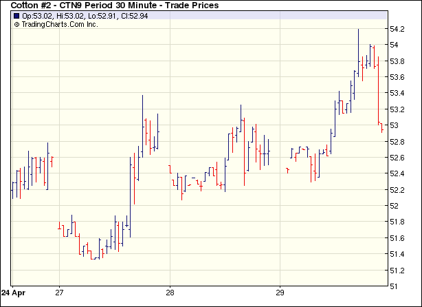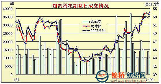 4月29日紐約期棉期棉受外圍利好支撐,在買盤支持下盤中大幅沖高,并收于6個(gè)月來(lái)高點(diǎn)。當(dāng)日期棉市場(chǎng)平開(kāi)高走,由于美國(guó)第一季度經(jīng)濟(jì)萎縮幅度小于市場(chǎng)預(yù)期以及美聯(lián)儲(chǔ)認(rèn)為美國(guó)經(jīng)濟(jì)衰退速度減緩,美股強(qiáng)勁反彈,主要股指全線飆升2%以上;同時(shí)商品期貨市場(chǎng)走強(qiáng),為期棉帶來(lái)支撐,在投機(jī)及基金買盤的支持下,棉價(jià)大幅攀升,7月合約最高至54.19美分/磅。受賣盤打壓,收盤前棉價(jià)回落,多數(shù)合約小幅收漲;5月合約漲79點(diǎn),收于52.84美分/磅;7月合約漲59點(diǎn),收于53.34美分/磅,為08年11月初以來(lái)最高點(diǎn)。 紐約棉花期貨主力0907合約近三個(gè)交易日交易走勢(shì) |