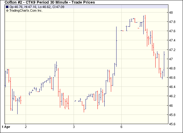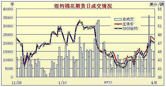 由于外圍市場壓力及獲利回吐盤打壓,6日紐約期棉小幅收跌。當(dāng)日市場小幅低開后窄幅震蕩,交易清淡,5月合約最高至47.94美分/磅。后大豆、原油期貨走弱,同時美股下跌,帶動期棉投機賣盤活躍,加之獲利回吐盤的打壓,期棉價下滑且小幅收低。5月合約跌57點,收于47.03美分/磅;7月合約跌57點,收于47.86美分/磅。 紐約棉花期貨首期0905合約近三個交易日交易走勢 |