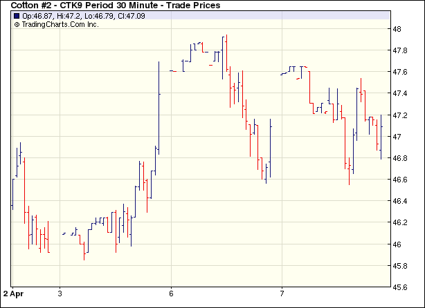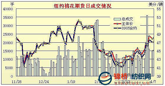 4月7日紐約期棉成交放量,中幅震蕩,多數(shù)合約小幅收漲。當(dāng)日市場高開高走,5月合約最高至47.65美分/磅。美國股市大幅低開導(dǎo)致期棉回落,5月合約最低至46.55美分/磅。后低位買盤涌入助棉價(jià)反彈,基本與開盤持平。當(dāng)日多數(shù)合約小幅收漲,5月合約漲5點(diǎn),收于47.08美分/磅;7月合約漲5點(diǎn),收于47.91美分/磅。 紐約棉花期貨首期0905合約近三個(gè)交易日交易走勢 |