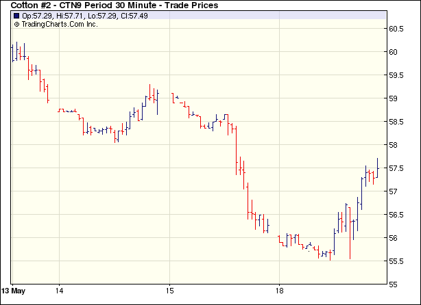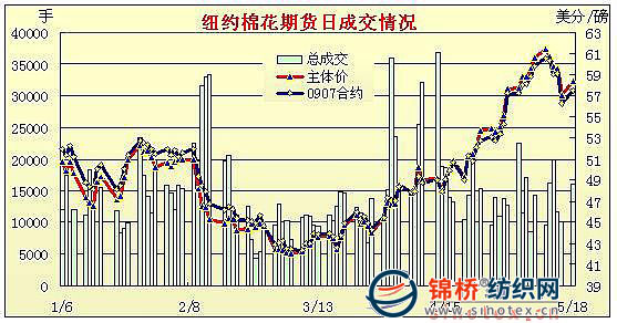 在繼上一個(gè)交易日大幅下跌后,5月18日紐約期棉市場(chǎng)賣盤力量薄弱,國(guó)際股市和原油期貨上漲給予助力,全面收漲,近期7月合約收于57.55美分,漲125點(diǎn)。當(dāng)日市場(chǎng)低開(kāi)低走,上半個(gè)交易日表現(xiàn)平淡;后美國(guó)股市上漲、大豆和原油期貨走高,國(guó)外印度股市暴漲,期棉市場(chǎng)基金買盤受到刺激,促進(jìn)期棉一改陰霾反彈走高,最終以大漲收盤。美國(guó)和印度股市:美國(guó)將發(fā)布相關(guān)的房屋,市場(chǎng)預(yù)計(jì)房市狀況惡化的局面將有所緩解,對(duì)美國(guó)股市形成支持。另外,印度國(guó)大黨領(lǐng)導(dǎo)的執(zhí)政聯(lián)盟在大選中勝出后,印度股市大漲兩位數(shù)。 紐約棉花期貨近期0907合約近三個(gè)交易日交易走勢(shì) |