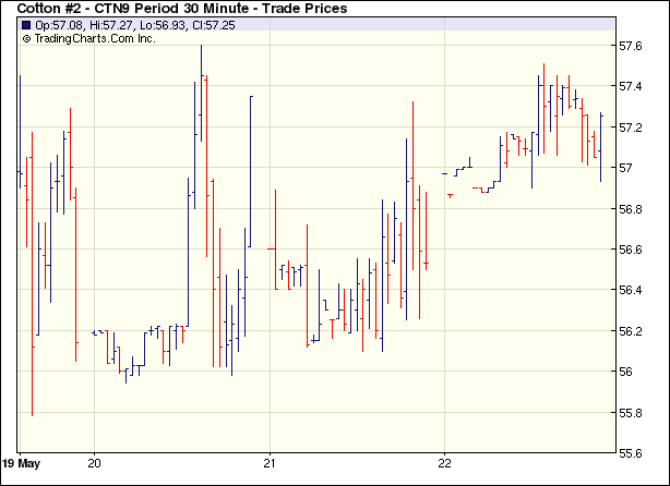 5月22日紐約期棉市場(chǎng)小幅回彈,近期7月合約收于57.11美分/磅,漲33點(diǎn),0912月合約收于60.38美分/磅,漲34點(diǎn)。美元持續(xù)下跌,給整個(gè)商品市場(chǎng)提供上漲動(dòng)力,包括期棉。市場(chǎng)成交量小,波動(dòng)空間不大。當(dāng)日市場(chǎng)穩(wěn)定開盤后一路上揚(yáng),美元下跌至由去年12月中旬以來的最低水平,商品市場(chǎng)則相應(yīng)上漲,給期棉以支持,7月合約最高上漲至57.51美分(+73點(diǎn))。尾段,受大豆期貨市場(chǎng)收盤前的獲利了結(jié)影響,期棉回吐部分漲幅,但最終仍以小漲收盤。 紐約棉花期貨近期0907合約近三個(gè)交易日交易走勢(shì) |
