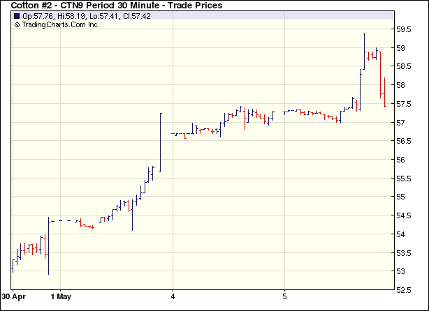 5月5日紐約期棉繼續(xù)走高,攀上近六個(gè)多月的高點(diǎn),主力7月合約收于58.05美分/磅,漲83點(diǎn)。當(dāng)日7月合約在技術(shù)面壓力和缺乏買盤的壓力下低開低走,但交易后期受到基金買盤和看漲期權(quán)買盤支持,7月合約毫不猶豫沖高,最高漲至59.39美分/磅,漲幅超過200點(diǎn)。有交易商獲利了結(jié),市場(chǎng)回吐部分漲幅,最終前三個(gè)合約分別上漲80、83和95點(diǎn),其他合約漲幅均過百點(diǎn)。分析師指出,RSI已經(jīng)高達(dá)70,技術(shù)面上市場(chǎng)近期有回調(diào)的要求。基本面上情況仍不太樂觀,但主要產(chǎn)棉區(qū)種植時(shí)節(jié)天氣未達(dá)到理想狀態(tài),給市場(chǎng)一定支持。 紐約棉花期貨主力0907合約近三個(gè)交易日交易走勢(shì) |