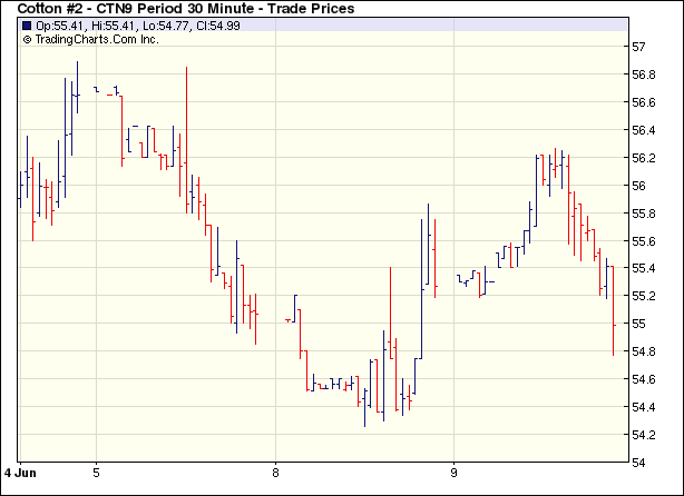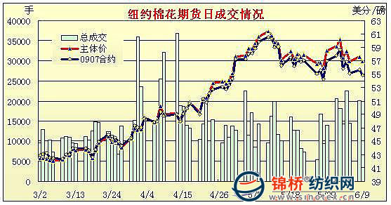 6月9日雖美元走弱,外圍市場走強,但紐約期棉受賣盤打壓,小幅收跌,當(dāng)日成交縮量。7月合約跌81點,收于54.86美分/磅;10月合約跌72點,收于57.60美分/磅。當(dāng)日市場低開后小幅震蕩,受外圍商品市場的帶動,午盤后一度高走,7月合約最高至56.27美分/磅,較開盤上漲1.02美分;但隨后在賣盤打壓下很快回落,7月合約最低至54.77美分/磅,盤終中幅收跌。隨著持倉重心轉(zhuǎn)移,目前12月合約的持倉量已超過7月合約。 紐約棉花期貨近期0907合約近三個交易日交易走勢 |