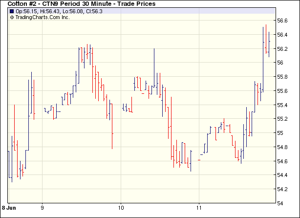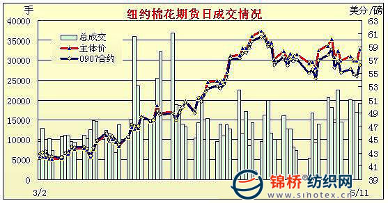 6月11日美元下跌助商品市場(chǎng)走強(qiáng),紐約期棉交投活躍,各合約大幅上漲,7月合約收于本周來(lái)最高點(diǎn)。當(dāng)日美元收跌,推動(dòng)資金流入商品市場(chǎng)。紐約期棉小幅高開(kāi)后震蕩走高,午盤(pán)后漲幅加劇,尾盤(pán)時(shí)7月合約達(dá)56.54美分/磅。盤(pán)終各合約大幅收漲,7月合約收于56.30美分/磅,漲167點(diǎn);10月合約漲180點(diǎn),收于59.18美分/磅。 紐約棉花期貨近期0907合約近三個(gè)交易日交易走勢(shì) |