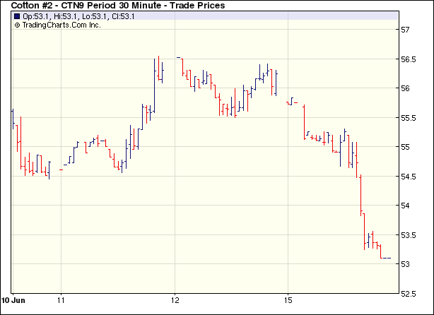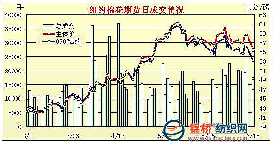 6月15日美元飆升使商品市場受到賣盤打壓,紐約期棉增量下跌,前7個合約全部收于跌停板。當日美元大幅上漲導(dǎo)致市場承受重壓,美國股市、農(nóng)產(chǎn)品期貨、原油均走弱。紐約期棉市場小幅高開,受基金平倉的影響,價格一路下滑。午盤后賣盤越發(fā)活躍加大市場跌幅,盤終各合約大幅收跌,前7個合約均收跌300點。7月合約收于53.10美分/磅,跌300點;10月合約收于56.15美分/磅,跌300點。 紐約棉花期貨近期0907合約近三個交易日交易走勢 |