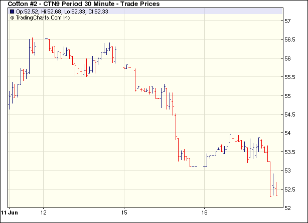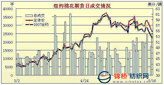 16日紐約期棉繼續(xù)前一日跌勢(shì),受外圍市場(chǎng)影響小幅收跌,成交量也有所減少。當(dāng)日市場(chǎng)小幅低開(kāi),受美元盤(pán)中走弱的影響,期棉受買(mǎi)盤(pán)支持中幅走高,7月合約最高至53.97美分/磅。后美元走強(qiáng),美國(guó)股市及原油下跌;期棉受到基金平倉(cāng)的打壓,同時(shí)觸發(fā)止損賣盤(pán),導(dǎo)致價(jià)格快速回落,7月合約最低至52.29美分/磅,較最高點(diǎn)跌168點(diǎn)。盤(pán)終各合約小幅收跌,7月合約收于52.43美分/磅,跌67點(diǎn);10月合約收于55.60美分/磅,跌55點(diǎn)。 紐約棉花期貨近期0907合約近三個(gè)交易日交易走勢(shì) |