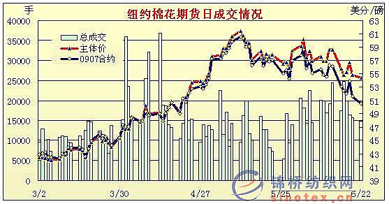6月22日紐約期棉承接上周五的跌勢,在外圍市場的影響下價格中幅下滑,同時持倉量也繼續(xù)縮減。當日市場平開后一段時間內(nèi)有小幅上漲,但是受美元走強的影響,昨日美股、原油及大豆紛紛走弱,拖拽期棉價格快速下滑。近期7月合約最低至50.15美分/磅,主力12月合約最低至54.99美分/磅。接近尾盤時,期棉受少量買盤支持,價格出現(xiàn)反彈,但仍未改當日跌勢。盤終市場中幅收跌,7月合約收于50.51美分/磅,跌105點;12月合約收于55.49美分/磅,跌89點。 紐約棉花期貨近期0907合約近三個交易日交易走勢 |