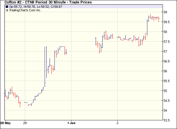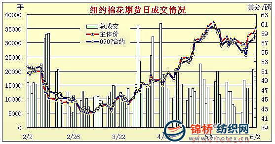 6月2日紐約期棉在買盤帶動下繼續(xù)中幅上揚,形成三連陽。當日市場平開后小幅震蕩,獲利回吐拋盤使市場一度走低,其中7月合約最低至57.25美分/磅。午盤后在基金買盤及貿(mào)易空頭回補買盤的支持下,棉價大幅拉升,7月合約最高至58.88美分/磅。盤終各合約收于高位,7月合約收于58.65美分/磅,漲86點;10月合約收于60.93美分/磅,漲69點。 紐約棉花期貨近期0907合約近三個交易日交易走勢 |