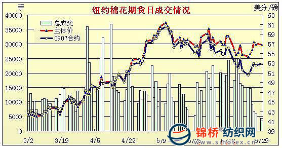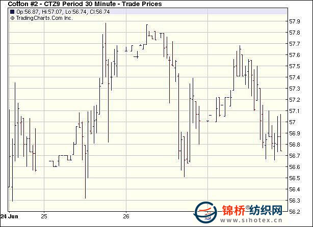 6月29日紐約期棉市場依舊以觀望為主,當日成交極為清淡,僅3千余手。美國農(nóng)業(yè)部(USDA)美棉面積報告將于周二公布,整個市場高度關(guān)注。當日期棉主力12月合約平開后震蕩高走,最高至57.68美分/磅,較開盤高出84點。隨后市場中缺乏買盤支持,導致價格回落。盤終前4個合約小幅收漲,其它遠期合約小幅收跌。近期7月合約收于52.86美分/磅,漲32點;主力12月合約收于56.97美分/磅,漲13點。 紐約棉花期貨主力0912合約近三個交易日交易走勢 |