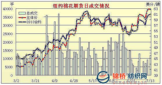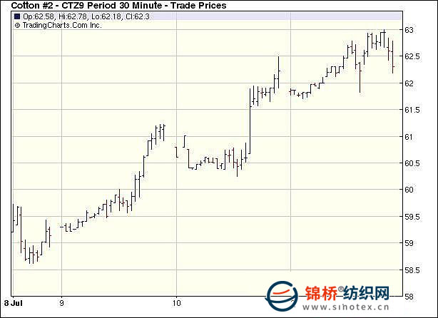 7月13日美元走弱,股市大漲為期棉帶來(lái)部分支撐,但其它谷物繼續(xù)弱勢(shì),紐約期棉上漲勁道趨減,USDA報(bào)告關(guān)于下年度的預(yù)測(cè)促使遠(yuǎn)期合約壓力較大,盤(pán)終只有近期和主力12月合約小幅上揚(yáng),其它合約則下跌,時(shí)間越遠(yuǎn),跌幅越大。當(dāng)日期棉開(kāi)盤(pán)后震蕩走低,但在美元走低和股市大漲的刺激下,期棉緩慢回升,與其它大宗商品走勢(shì)依然形成對(duì)比,盤(pán)中12月合約最高漲至63美分/磅,為近八周新高,但高位快速回落,遠(yuǎn)期合約由于USDA報(bào)告調(diào)降下年度產(chǎn)量和出口量,調(diào)增美棉的期末庫(kù)存,因此承受壓力較大,盤(pán)終遠(yuǎn)期合約普跌,只有近期合約漲57點(diǎn),主力10月合約漲21點(diǎn)。另市場(chǎng)缺乏方向指引,交易商等候本周公布的經(jīng)濟(jì)數(shù)據(jù),交投縮量。 紐約棉花期貨主力0912合約近三個(gè)交易日交易走勢(shì) |