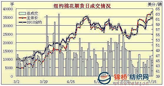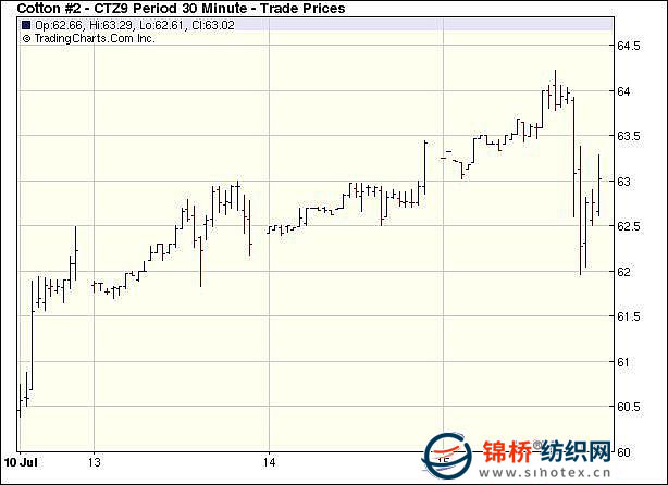 7月15日美聯(lián)儲公布6月份會議記錄顯示美聯(lián)儲決定不增加購買資產(chǎn)計劃,另對美國經(jīng)濟持謹慎樂觀態(tài)度。市場風險偏好回升,推動美元大跌,兼美國股市大漲,早盤期棉與大多數(shù)大宗商品大漲,期棉突破之前高點,創(chuàng)出新高,但獲利盤打壓明顯,尾盤大多合約小跌,成交活躍。當日紐約期棉開盤后延續(xù)強勢,小幅震蕩后再度走高,在美元走跌的影響下各商品紛紛開始大幅上漲,期棉12月合約突破5月12日的高位,最高漲至64.22美分,但是高位獲利回吐賣盤大肆打壓(與上周低點相比漲幅為571點,而與6月22日低點相比漲幅已高達945點),期棉快速回落,當然,大豆和玉米也開始大幅下跌,或許對期棉給予一定影響。尾盤階段,期棉跌幅有所縮小,盤終大多合約僅小幅收跌6-30點。 紐約棉花期貨主力0912合約近三個交易日交易走勢 |