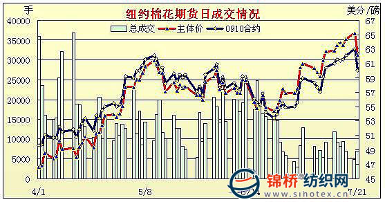 7月21日美聯(lián)儲(chǔ)主席伯南克國(guó)會(huì)發(fā)言,稱(chēng)失業(yè)問(wèn)題,房?jī)r(jià)回落兼信貸緊張將影響消費(fèi)者信心,除原油繼續(xù)上漲外,其它大宗商品大多回落,紐約期棉早盤(pán)窄幅震蕩,午盤(pán)后賣(mài)盤(pán)放量回落,期棉10月合約收于跌停,而主力合約也跌291點(diǎn),逼近跌停。當(dāng)日紐約期棉開(kāi)盤(pán)后窄幅區(qū)間小幅震蕩,期棉12月合約突破周一高位,上行至64.98美分(漲幅為12點(diǎn)),早盤(pán)收尾時(shí),期棉開(kāi)始回落,跌破周一低點(diǎn)(63.31美分)后激勵(lì)進(jìn)一步的賣(mài)盤(pán),獲利回吐,尾盤(pán)最后一個(gè)小時(shí),10月合約跌停,而主力12月也迫近跌停,絕大多數(shù)合約跌幅超過(guò)200點(diǎn)。期權(quán)交投包括2100份看漲期權(quán)和3000看跌期權(quán)。 紐約棉花期貨主力0912合約近三個(gè)交易日交易走勢(shì) |