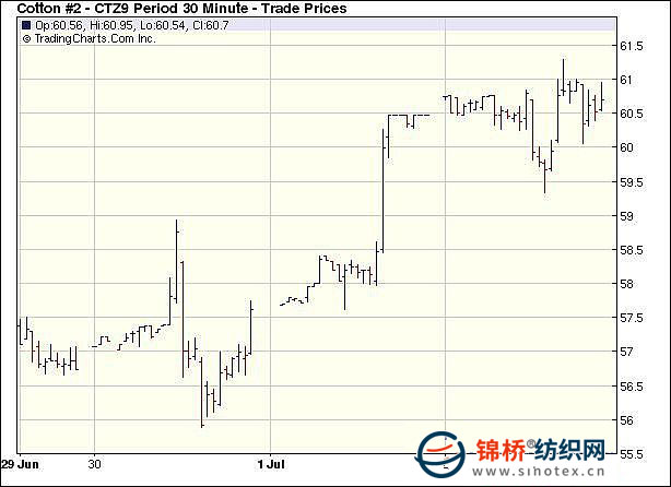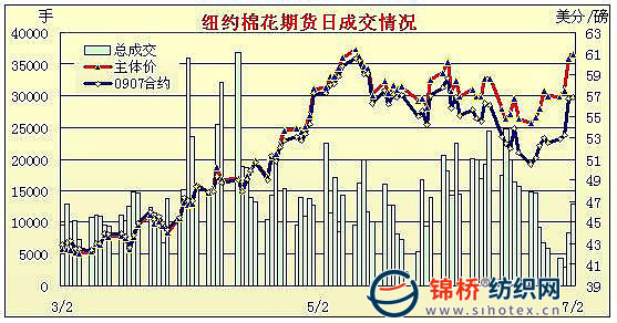 6月2日由于歐洲和美國就業(yè)數(shù)據(jù)令人失望,歐美股市大跌,而美元大幅走高,美棉出口裝運(yùn)良好,支撐期棉在整體利空環(huán)境下保持上漲,近期7月合約小漲7點(diǎn),收于56.80美分,12月合約漲44點(diǎn)收于60.92美分。當(dāng)日紐約期棉高開,但早盤震蕩回落,隨后歐美先后公布利空的就業(yè)報告,主要股市大幅下跌3%左右,刺激美元的避險需求,美元大漲,而大多商品回落,拖拽期棉下跌,12合約盤中最低59.33美分,但低位獲得移倉買盤支撐,另外公布的美棉出口周報顯示美棉出口和裝運(yùn)均增速較快,完成USDA的目標(biāo)基本沒有問題,因此期棉獲得快速拉升,收盤時各個合約小幅收漲。 紐約棉花期貨主力0912合約近三個交易日交易走勢 |