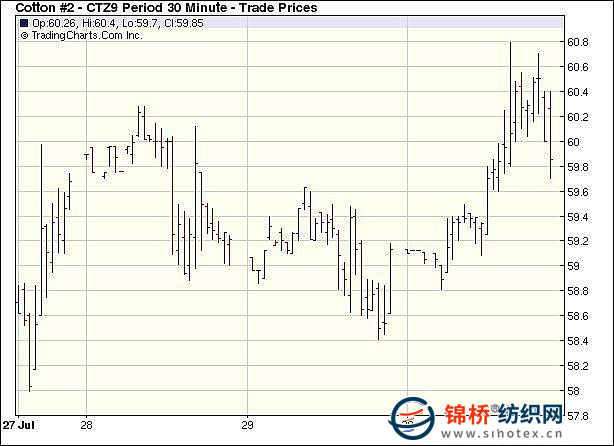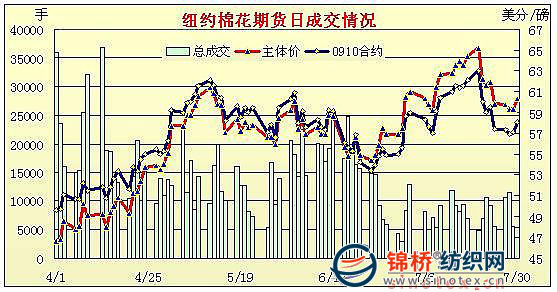 經(jīng)過數(shù)日盤整震蕩之后,7月30日紐約期棉出現(xiàn)大幅反彈,多數(shù)合約收漲百點以上。但市場中觀望氣氛仍比較濃重,交易量清淡。昨日美元走弱,美國股市及商品市場走強,其中NYMEX原油8月合約收漲3.59美元至66.94美元/桶。ICE期棉平開后微幅波動,午盤后受外圍提振,在投機及基金買盤支持下震蕩走高,主力12月合約最高至60.79美分/磅。接近尾盤時漲幅有所回落,各合約收漲百點左右。10月合約漲102點,收于58.08美分/磅;12月合約漲99點,收于60.11美分/磅。 紐約棉花期貨主力0912合約近三個交易日交易走勢 |