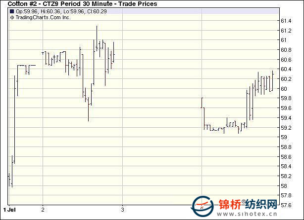 7月6日紐約期外圍商品走跌助推,盤中大多合約中幅下跌,12月合約跌68點(diǎn)收于60.24美分。當(dāng)日紐約期棉低開低走,由于上周期棉大幅上攻,因此獲利賣盤打壓期棉大幅走低,同時(shí)外圍商品均走弱,兼全球股市走弱(美盤小漲倒是例外)也拖拽期棉下跌,盤中12合約最低跌至59.07美分,然后獲得部分買盤支撐,緩慢上漲,盤終縮窄跌幅,但成交大幅縮量,僅有5100手。 紐約棉花期貨主力0912合約近三個(gè)交易日交易走勢 |