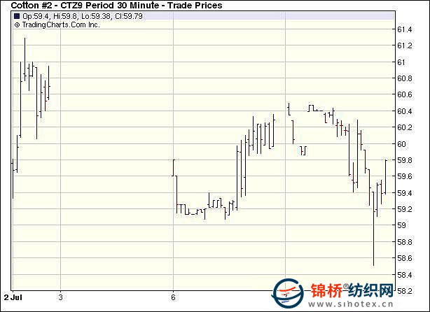 7月7日外圍市場(chǎng)延續(xù)大幅調(diào)整態(tài)勢(shì),歐美股市盡皆下調(diào),美元上漲,大宗商品持續(xù)回落,其中大豆暴跌7.06%,但紐約期棉交投清淡,尾盤從跌勢(shì)中回升,盤終12月合約跌53點(diǎn)收于59.71美分。當(dāng)日紐約期棉基本平開,窄幅震蕩,其后在少量賣盤打壓之下有所下跌,同時(shí)外圍壓力加大,12月合約跌破59.07美分時(shí)觸發(fā)止損賣盤,期棉加速下跌,最低觸及58.51的低位,但之后期棉再度由低位緩慢回升,盤終跌幅大幅縮窄至61點(diǎn)之內(nèi),與其它品種相比,已經(jīng)相當(dāng)強(qiáng)勢(shì)。 紐約棉花期貨主力0912合約近三個(gè)交易日交易走勢(shì) |