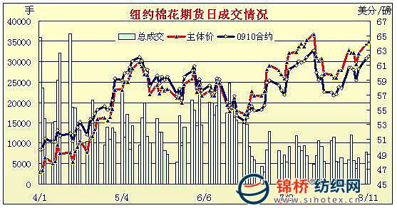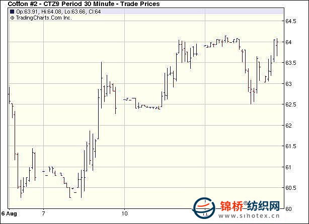 8月11日,紐約期棉走勢(shì)呈穩(wěn)-跌-漲的狀態(tài),結(jié)算價(jià)繼續(xù)收高,目前已達(dá)到近三周高點(diǎn),近期10月合約結(jié)算價(jià)62.24美分/磅,漲29點(diǎn),主力12月合約收于64.00美分/磅,漲25點(diǎn)。當(dāng)日期棉市場(chǎng)在穩(wěn)定開(kāi)盤(pán)后前半個(gè)交易日一直維持平穩(wěn)狀態(tài),后受外部美國(guó)股市連續(xù)第二日走低及其他部分商品期貨走低連累下跌,最低點(diǎn)至62.42美分(-133點(diǎn))。大豆期貨大幅上漲,輔助期棉從低點(diǎn)反彈,并以小幅收漲。市場(chǎng)成交量低迷,主要是交易商都在等待USDA(美國(guó)農(nóng)業(yè)部)的供需月報(bào)和美國(guó)面積報(bào)告的發(fā)布。該報(bào)告預(yù)期中性偏空--美國(guó)西德州出現(xiàn)及時(shí)降雨,即使其他個(gè)別地區(qū)干旱也不能影響大局,USDA可能調(diào)高美國(guó)棉花產(chǎn)量。 紐約棉花期貨主力0912合約近三個(gè)交易日交易走勢(shì) |