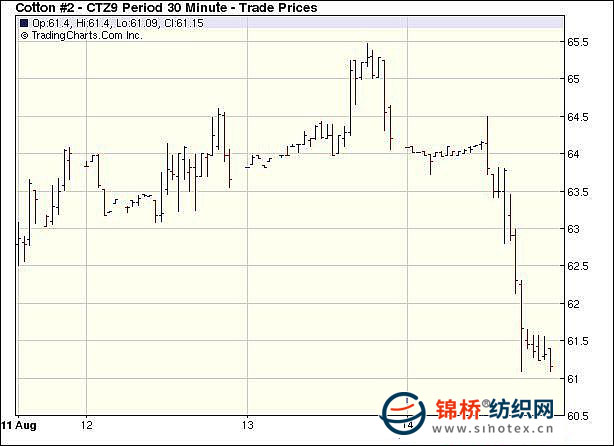 8月14日,外部市場(chǎng)不利走勢(shì)和本周最后的一天交易“招來(lái)”投機(jī)商多頭清算,致使紐約期棉重創(chuàng),近期10月合約止于跌停板,結(jié)算價(jià)59.21美分/磅,0912月合約下跌297點(diǎn),收于61.12美分,其他合約跌251-288點(diǎn)不等。當(dāng)日期棉渡過(guò)了穩(wěn)定的開(kāi)盤(pán)和少數(shù)幾個(gè)小時(shí)的穩(wěn)定后暴跌,整個(gè)商品市場(chǎng)谷物、能源、金屬期貨和美國(guó)股市下跌、美元走強(qiáng),給ICE期棉市場(chǎng)予以沉重打擊,投機(jī)商賣(mài)盤(pán)“落井下石”,市場(chǎng)最終以觸及跌停板收盤(pán)。美國(guó)8月消費(fèi)者信心指數(shù)從7月份的66.0下降至63.2,不及市場(chǎng)預(yù)期。這是自3月以來(lái)該指數(shù)的最低值,同時(shí)也遠(yuǎn)遠(yuǎn)低于此前經(jīng)濟(jì)學(xué)家所平均預(yù)期的69.0。該指數(shù)報(bào)告公布后,美股迅速跳水。 紐約棉花期貨主力0912合約近三個(gè)交易日交易走勢(shì) |