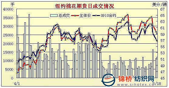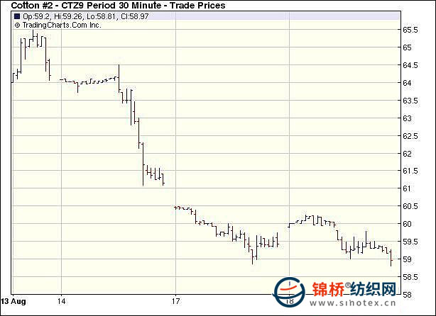 8月18日,紐約期棉連續(xù)三日收跌,近期10月合約收于56.71美分/磅,跌57點(diǎn),主力12月合約58.89美分/磅,跌52點(diǎn)。當(dāng)日市場(chǎng)表現(xiàn)先強(qiáng)后弱,最高點(diǎn)曾上沖到60.25美分,但即使外部美元走弱、股市上漲和商品市場(chǎng)反彈,但投資者仍拋出棉花,迫使市場(chǎng)從高點(diǎn)回落。棉花消費(fèi)形勢(shì)不妙以及基本面上產(chǎn)量前景樂觀,給市場(chǎng)帶來壓力,12月合約在跌破技術(shù)支撐點(diǎn)59.00美分后繼續(xù)下行,最終收于該位之下。美國(guó)股市雖稍稍反彈,但因第三季度的經(jīng)濟(jì)狀況仍不容樂觀,市場(chǎng)壓力較大。現(xiàn)貨市場(chǎng)也并未因期棉下跌成交增加,,如現(xiàn)貨市場(chǎng)持續(xù)低迷,投機(jī)商賣盤可能出擊,迫使12月合約撕破58美分。 紐約棉花期貨主力0912合約近三個(gè)交易日交易走勢(shì) |
