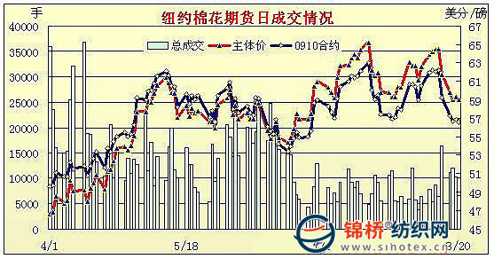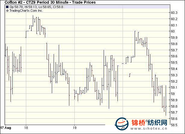 8月20日,紐約期棉市場表現(xiàn)疲軟,10月合約結(jié)算價(jià)56.62美分/磅,跌24點(diǎn),12月合約58.75美分/磅,跌28點(diǎn),總成交量不足6000手。當(dāng)日在投機(jī)商買盤作用下,市場高開高走,但12月合約最高點(diǎn)沖至60美分這一技術(shù)阻力位后缺乏動能掉頭向下,一來投機(jī)商無大動作,二來期棉市場忽略了外部市場美元下跌和股市走強(qiáng)的利好因素。在破位失敗后,12月合約收平于關(guān)鍵技術(shù)支撐點(diǎn)58.75美分位置。8.7-8.13一周美國凈簽約僅出口09/10年度陸地棉7326噸,較前一周大幅減少;裝運(yùn)陸地棉28939噸、出口皮馬棉1315噸。 紐約棉花期貨主力0912合約近三個(gè)交易日交易走勢 |