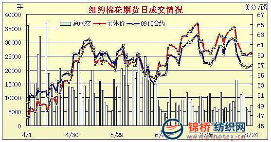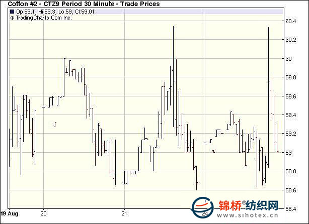 8月24日,紐約期棉小幅反彈,近期10月合約收于56.92美分/磅,漲47點(diǎn),0912月合約收于59.07美分,漲44點(diǎn),59美分成“臨時(shí)支撐點(diǎn)”,盤終60美分上位失?。怀山涣砍掷m(xù)低迷。雖然美元走強(qiáng)、股市漲跌不一,但整個(gè)商品期貨市場表現(xiàn)強(qiáng)勢,谷物期貨大幅上漲,刺激投機(jī)商買盤介入期棉,促使市場拋開一切“不利雜音”結(jié)束連跌。市場開盤和上半場交易穩(wěn)定,盤中破掉60美分,最高上漲到60.33美分,后進(jìn)入震蕩階段,最終以稍高于59美分收盤。 紐約棉花期貨主力0912合約近三個(gè)交易日交易走勢 |