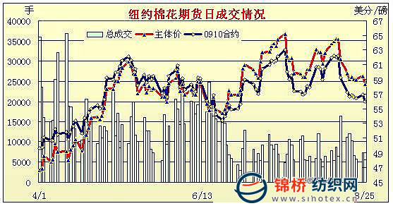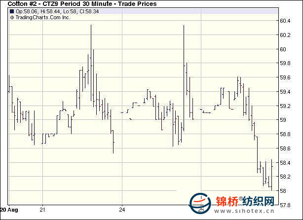 8月25日,紐約期棉市場大幅下跌,近期10月合約收于55.97美分/磅,主力12月合約 58.15美分/磅,跌92點?;久嬗欣孟⒅С郑稒C商或買或賣,是左右市場漲跌的主要力量。當(dāng)日市場高開高走,上半場交易始終位于關(guān)鍵支撐位59.00美分以上波動,因獲利了結(jié)賣盤和投機賣盤打壓,加上外部谷物期貨市場下跌,期棉市場從高點回落,12月合約低點觸及58.00美分/磅,最終以接近百點跌幅報收。 紐約棉花期貨主力0912合約近三個交易日交易走勢 |