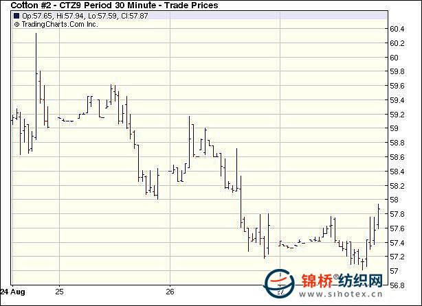 8月27日,紐約期棉以微幅上漲收盤,近期10月合約和主力12月合約同漲17點,結算價分別為55.54和57.64美分/磅,盤中12月合約波動未超出57.00-58.00美分的范圍。當日市場上半場交易呈震蕩上揚狀態(tài),投機買盤和貿(mào)易商空頭平倉給予支撐,當12月合約最高上漲至57.94美分后上漲動能不足,從高點稍稍回落,最終以小幅上漲收盤。外圍谷物期貨市場漲跌不一,美元下跌、美股上揚,期棉缺乏指引,但在投機買盤的作用下表現(xiàn)相對獨立。美棉出口周報顯示,上周美棉出口大幅增加,給市場一定支持。據(jù)美國農(nóng)業(yè)部(USDA)公布,8.14-8.20一周美國凈簽約出口09/10年度陸地棉53070噸,較前一周增加6倍;裝運本年度陸地棉45518噸,較前周增加57%。 紐約棉花期貨主力0912合約近三個交易日交易走勢 |