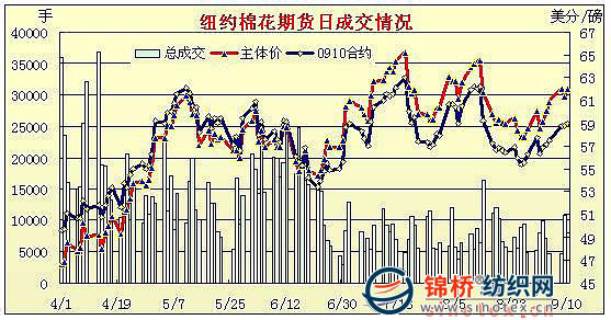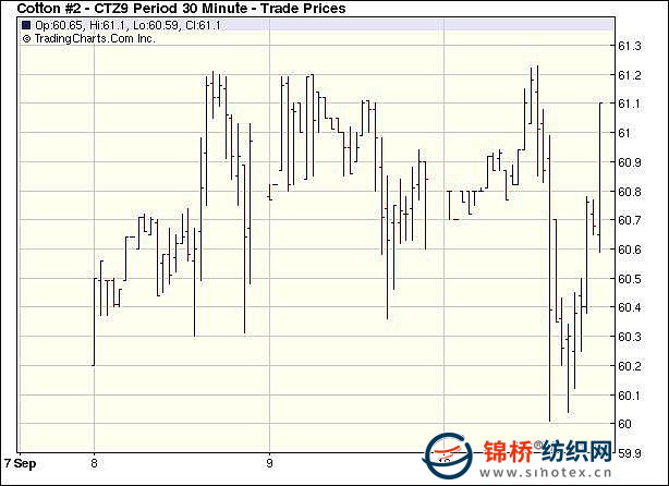 10月10日,紐約期棉市場仍以觀望為主,期待今晚的USDA報告能帶來方向指引,因此成交量縮減至六千余手。市場前半場走勢平穩(wěn),后半場振幅加大,買盤支持使棉市再度小幅收漲。當(dāng)日市場開盤后小幅波動,午盤時主力12月合約升至當(dāng)日最高點61.23美分/磅,但隨后遭賣盤打壓,從高點滑落至最低60.01美分/磅。后因美元下跌為商品市場帶來支撐,期棉受助于投機買盤從低點反彈并小幅收高。除10年10月合約外,其它合約均小幅收漲,近期10月合約收于58.99美分/磅,漲21點;12月合約收于60.92美分/磅,漲15點。 紐約棉花期貨主力0912合約近三個交易日交易走勢 |