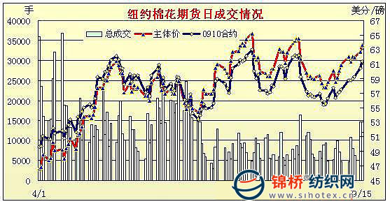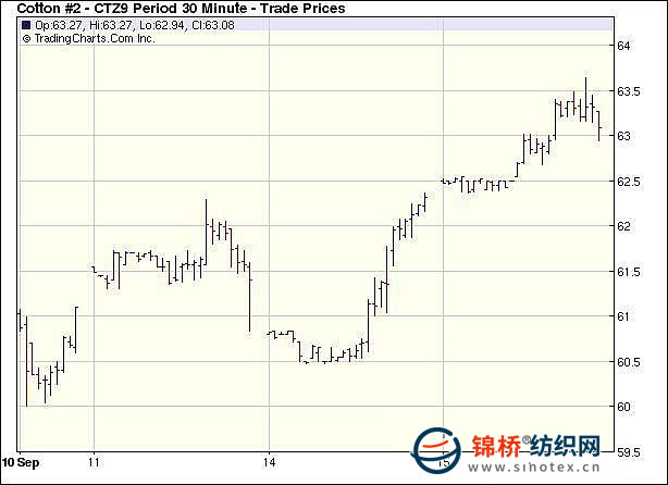 9月15日,在外圍市場(chǎng)提振以及美國(guó)8月零售報(bào)告利好的支持下,紐約期棉延續(xù)前一日的漲勢(shì),再度大幅收漲,主力12月合約連續(xù)9個(gè)交易日收漲??偝山涣枯^前一日有所增加。當(dāng)日期棉市場(chǎng)高開(kāi)高走,美元走弱以及外圍谷物市場(chǎng)走強(qiáng)給期棉帶來(lái)支撐;當(dāng)主力合約突破63美分/磅關(guān)鍵阻力位時(shí),引來(lái)更多基金買盤參與,使價(jià)格進(jìn)一步攀升,當(dāng)日最高至63.64美分/磅。臨近收盤時(shí)漲幅略有回落,最終主力合約收于63.02美分/磅,漲幅81點(diǎn),為今年8月13日(64.09美分/磅)以來(lái)最高點(diǎn)。近期10月合約收于61.42美分/磅,漲96點(diǎn)。美國(guó)商務(wù)部周二報(bào)告稱,經(jīng)過(guò)季節(jié)性因素調(diào)整之后的美國(guó)8月零售銷售收入環(huán)比增長(zhǎng)了2.7%,為三年多來(lái)最大漲幅。報(bào)告認(rèn)為,8月份零售業(yè)銷售收入大幅增長(zhǎng)主要是受到政府提供的購(gòu)車補(bǔ)貼、汽油價(jià)格攀升以及零售店面客流量增加等因素的推動(dòng)。 紐約棉花期貨主力0912合約近三個(gè)交易日交易走勢(shì) |