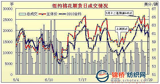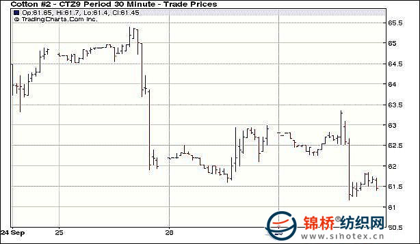 9月29日,紐約期棉市場大幅下跌,對技術(shù)面的憂慮導(dǎo)致投機(jī)賣盤活躍,各合約收跌百余點(diǎn),完全抵消前一日漲幅。當(dāng)日市場低開低走,因擔(dān)憂市場超買嚴(yán)重,投機(jī)賣盤活躍,對市場形成打壓;此外美股下跌以及美元上漲也對期棉形成壓力。盤中觸發(fā)止損賣盤導(dǎo)致價格進(jìn)一步下跌,主力合約最低至61.17美分/磅。尾盤時少量買盤對價格形成支撐,但未能改變大跌之勢,最終各合約收于低位,10月合約收于60.05美分/磅,跌145點(diǎn);12月合約收于61.45美分/磅,跌145點(diǎn),為兩周來低點(diǎn)。 紐約棉花期貨主力0912合約近三個交易日交易走勢 |