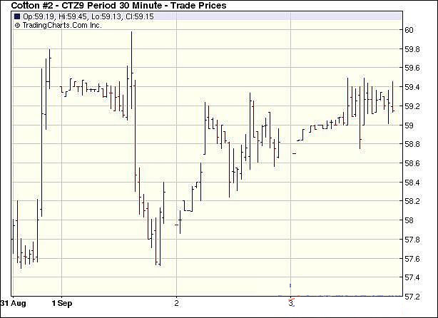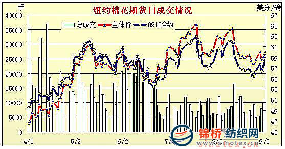 9月3日,美國公布8月份零售數(shù)據(jù)好于預(yù)期,美國股市走高,同時美棉出口數(shù)據(jù)強勁,提振期棉走強,雖然外圍商品大多呈現(xiàn)弱勢,盤終期棉各合約小幅走高。當(dāng)日紐約期棉低開,不過期棉主力合約逐步攀高至59.49美分,有所回落,其后受利好的美棉出口數(shù)據(jù)支撐,期棉再度走強,尾盤持續(xù)的買盤推動期棉收漲,10月近期合約收漲26點于57.15美分,而主力12月合約再漲33點收于59.24點,不過成交清淡,期權(quán)成交僅僅包括100份看漲期權(quán)和90份看跌期權(quán)。據(jù)美國農(nóng)業(yè)部(USDA)公布,8.21-8.27一周美國凈簽約出口09/10年度陸地棉69286噸,較前一周增加31%。中國簽約進口美棉增至2萬噸,可以看出不少國家趁低位加大了進口量。 紐約棉花期貨主力0912合約近三個交易日交易走勢 |