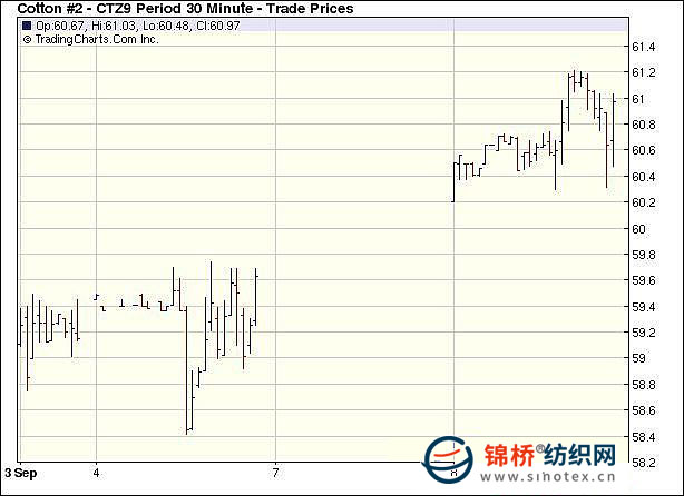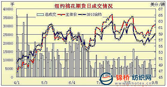 9月8日美元下跌為商品期貨市場帶來活力,紐約期棉受外圍市場帶動(dòng)大幅走高,形成四連陽,當(dāng)日成交量也增至萬手以上。當(dāng)日市場高開高走,由于美元跌至一年來低點(diǎn),玉米、大豆,原油及黃金期貨市場全部走強(qiáng),ICE期棉受外圍帶動(dòng),在買盤支持下大幅攀高,主力12月合約最高至61.25美分。盤終各合約收漲百點(diǎn)左右,近期10月合約收于58.78美分/磅,漲125點(diǎn);12月合約收于60.76美分/磅,漲113點(diǎn)。 紐約棉花期貨主力0912合約近三個(gè)交易日交易走勢 |