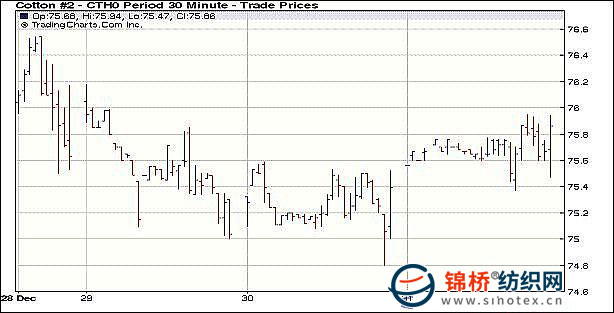 12月31日是2009年最后一個交易日,美元小幅走弱,支撐大宗商品走強,兼美棉陸地棉出口創(chuàng)年度新高,均利于紐約期棉小幅走高,盤終大部分合約小幅收漲。當日紐約期棉早盤小幅波動,沖高回落,受益于外圍商品普漲及利好的美棉出口周報,部分投機資金推動3月合約突破周三最高點75.59美分,最高攀至75.95美分/磅,但跟隨買盤不足,期棉高位滑落,盤終僅小幅收漲。同時由于投資者大多立場觀望,成交不旺。 據(jù)美國農(nóng)業(yè)部報告,12月18日-12月24日美國凈簽約出口本年度陸地棉79288噸,比前一周增加64%,創(chuàng)年度新高。裝運28237噸,較前一周增加14%。 紐約棉花期貨首期1003合約近三個交易日交易走勢 |