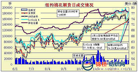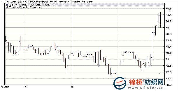 1月11日,美元繼續(xù)走弱,不過(guò)原油和大豆類(lèi)商品繼續(xù)高位震蕩小幅回落,中國(guó)期棉上漲推動(dòng)紐約期棉扭轉(zhuǎn)連續(xù)的跌勢(shì)反抽大漲,近期合約漲180點(diǎn)報(bào)收于74.24美分/磅。當(dāng)日紐約期棉小幅高開(kāi),然后就在漲幅70點(diǎn)附近震蕩,但在中國(guó)鄭棉上漲,兼市場(chǎng)預(yù)計(jì)USDA將小幅調(diào)降美國(guó)產(chǎn)量,出口調(diào)增的預(yù)期下,資金開(kāi)始拉升紐約期棉,3月合約上揚(yáng),在73.40美分和74.27美分處觸發(fā)止損買(mǎi)盤(pán),最高揚(yáng)升至74.47美分/磅,尾盤(pán)小幅回落。盤(pán)終各合約普漲110點(diǎn)以上,近期3份合約漲幅逼近200點(diǎn),同時(shí)成交較前活躍,而期權(quán)買(mǎi)盤(pán)成交7200張,賣(mài)盤(pán)成交1900張。 紐約棉花期貨首期1003合約近三個(gè)交易日交易走勢(shì) |