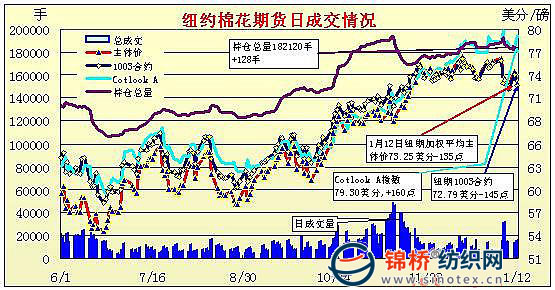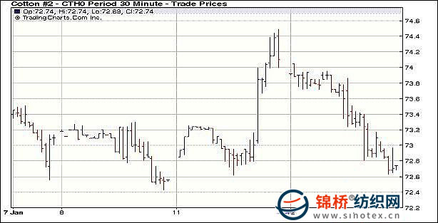 1月12日,中國意外調(diào)增存款準(zhǔn)備金率顯示政府政策已經(jīng)提前,打壓金屬和原油市場,盤中紐約期棉受外圍影響較多,大幅回落,盤終周二的漲幅基本抹殺。當(dāng)日紐約期棉小幅低開,低位運(yùn)行,USDA報(bào)告公布后,紐約期棉跌幅很快超過100點(diǎn),之后玉米和大豆等大跌再度引發(fā)投機(jī)資金賣盤打壓期棉,下探過程中觸發(fā)止損賣盤,期棉加速回落,跌破73美分,尾盤最低觸及72.63美分/磅,但高于周一低點(diǎn)72.55美分,終盤近期3份合約跌幅較大,其它合約跌幅相對較小。 紐約棉花期貨首期1003合約近三個(gè)交易日交易走勢 |