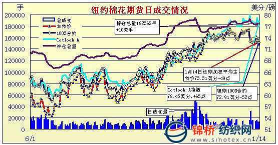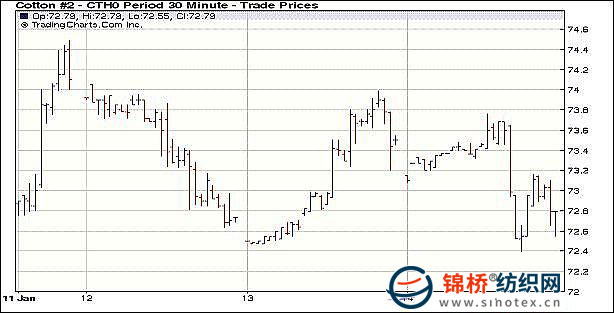 1月14日,美國零售數(shù)據(jù)出臺,略有降低,美元走弱,農(nóng)產(chǎn)品走勢疲弱,紐約期棉小幅沖高后尾隨外圍行情再度回落,盤終3月合約跌52點收于72.91美分。當日期棉小幅高開,窄幅震蕩,隨后3月主力合約沖高至73.80美分,不過跟進買盤不足,同時外圍農(nóng)產(chǎn)品急跌,紐約期棉跟隨回落,跌破72.54美分的周二低位時觸發(fā)新一輪的賣盤,繼續(xù)下跌至72.22美分,為近八周的低點,低位之際,買盤介入,期棉回升,盤終諸合約跌幅均在50點左右。 上周美國簽約出口陸地棉9.9萬噸,其中中國進口5.1萬噸。利好的美棉出口周報并未為期棉帶來利好結(jié)果。在春天播種即將來臨之際,市場關(guān)注種植面積之爭。部分分析師認為,美國零售數(shù)據(jù)意外下滑, 同時失業(yè)人數(shù)也在增加,市場質(zhì)疑經(jīng)濟恢復(fù)的動力是否不足。 紐約棉花期貨首期1003合約近三個交易日交易走勢 |