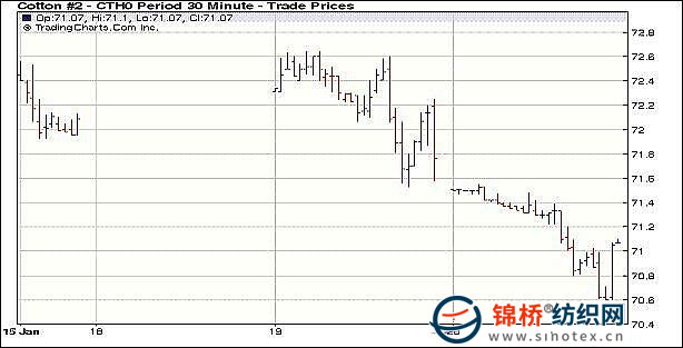 1月20日,市場(chǎng)避險(xiǎn)情緒升溫,美元大幅走強(qiáng),大宗商品普遍回落,期棉再度承壓下降,連續(xù)4天收陰,盤終3月合約跌84點(diǎn)收于70.80美分/磅。當(dāng)日期棉平開低走,全天低位運(yùn)行。受中國(guó)信貸收緊傳言,而歐洲經(jīng)濟(jì)樂觀情緒降溫,市場(chǎng)避險(xiǎn)需求大增,推動(dòng)美元大幅飆升,進(jìn)而導(dǎo)致整體商品市場(chǎng)普遍下跌,紐約期棉再遭投機(jī)賣盤拋售,連續(xù)下跌,3月合約跌破71美分,盤中最低觸及70.52美分/磅,之后得到商業(yè)買盤的支撐小幅縮窄跌幅,盤終各合約再度收跌,短線弱勢(shì)似乎仍未改變。 紐約棉花期貨首期1003合約近三個(gè)交易日交易走勢(shì) |