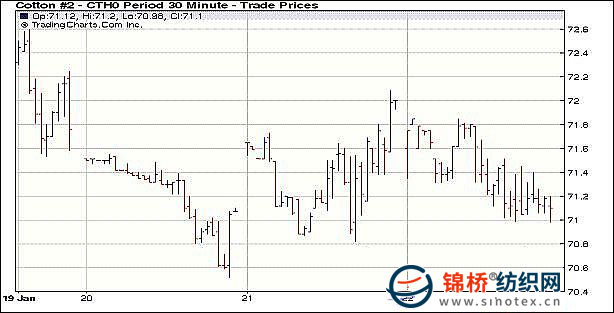 1月22日,美國總統(tǒng)對銀行監(jiān)管的不確定性促使美國股市大幅回落,大宗商品市場拋盤打壓,商品市場再度震蕩回落,紐約期棉窄幅區(qū)間震蕩下跌,盤終3月合約保住71美分的整數(shù)關(guān)口,各個合約前日漲幅基本抹掉。當日紐約期棉平開低走,整個交易日3月主力合約基本在下方運行,雖然盤中期棉3月合約在71.10美分處獲得買盤支撐,但政府對于銀行監(jiān)管的不確定性促使股市再度大跌,商品市場浮現(xiàn)投機賣盤,大宗作物大多延續(xù)下跌,外圍利空致使紐約期棉前日漲幅喪失,尾盤20分鐘內(nèi),3月合約再度下跌,最低觸及70.98美分,并未探至前日低位70.82美分,盤終收于71.07美分。 紐約棉花期貨首期1003合約近三個交易日交易走勢 |