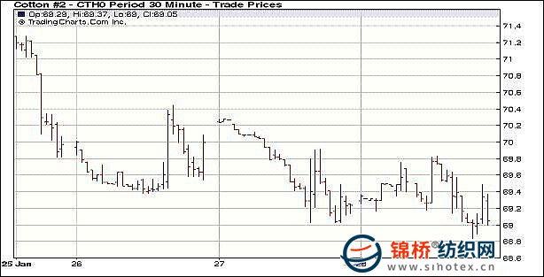 1月28日,美棉出口周報公布,顯示上周美棉出口再創(chuàng)佳績,為紐約期棉提供支持,但外圍美元繼續(xù)走強,工業(yè)品大跌,農(nóng)產(chǎn)品有止跌跡象,紐約期棉窄幅震蕩,盤終漲跌不一,3月合約小幅下挫9點,而5月合約小漲10點。當日紐約期棉小幅高開高走,利好的美棉出口數(shù)據(jù)推動紐約期棉維持強勢并小幅攀高,3月合約最高上漲至69.83美分,但外圍弱勢不改,股市走弱,工業(yè)品期貨大幅下跌,經(jīng)濟數(shù)據(jù)難言樂觀,促使投機賣盤繼續(xù)打壓期棉,ICE期棉從高點滑落,但賣盤力度不強,3月合約最低觸及68.83美分,低位貿易買盤介入,助期棉縮窄跌幅,尾盤3月合約僅微弱下跌。上周(1.15-1.21)美國凈簽約出口本年度陸地棉110563噸,為本年度最高,較前周增52%,較近四周平均值增49%;裝運33906噸,較前周減24%,較近四周平均值減1%;當周中國凈簽約進口本年度陸地棉64705噸,裝運12882噸。 紐約棉花期貨首期1003合約近三個交易日交易走勢 |