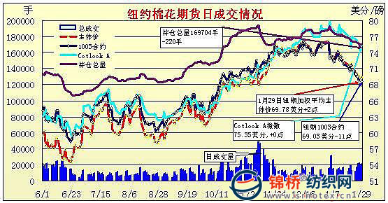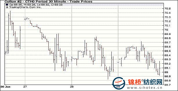 1月29日,美國第四季度GDP增速強勁,達(dá)到5.7%,超過市場預(yù)期,美元大幅飆升,大宗商品延續(xù)弱勢下跌,紐約期棉早盤走強,其后在外圍利空影響下微弱收跌。3月合約跌11點收于69.03美分,5月合約跌8點收于70.63美分/磅。當(dāng)日紐約期棉小幅高開,由于空頭回補兼貿(mào)易買盤支撐期棉,導(dǎo)致大多數(shù)時間期棉保持收漲態(tài)勢,但外圍美元強勢飆升,大宗商品均承壓回落,對于期棉產(chǎn)生利空影響,投機資金繼續(xù)撤離,導(dǎo)致最終紐約期棉微弱收跌。本周紐約期棉連跌5日,但近期跌勢明顯減弱。 紐約棉花期貨首期1003合約近三個交易日交易走勢 |