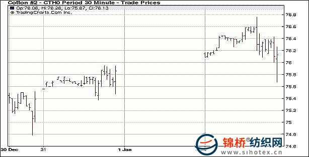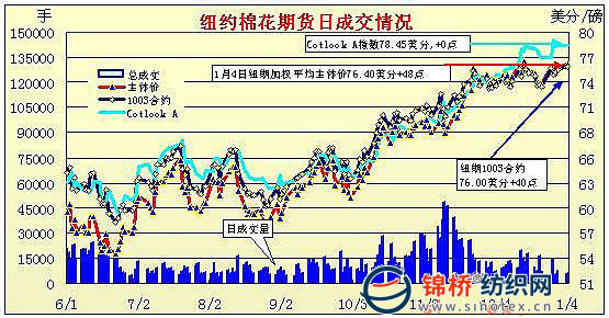 4日是2010年首個(gè)交易日,美元遭重挫,原油和黃金均大漲,帶動(dòng)農(nóng)產(chǎn)品走高,其中紐約期棉3月主力合約盤中再創(chuàng)16個(gè)月新高,盤終各合約小幅收漲。當(dāng)日期棉小幅高開,受益于美元大跌及外圍大漲利好,兼基金買盤涌入,期棉大幅沖高,其中3月合約最高攀至76.77美分,為16個(gè)月來高點(diǎn),但高位獲利賣盤壓力重挫期棉,致使期棉高位回落,盤終僅小幅收漲,當(dāng)日交投活躍,大幅放量。當(dāng)日紐約2月原油期貨大漲2.71%報(bào)每桶81.51美元。 紐約棉花期貨首期1003合約近三個(gè)交易日交易走勢(shì)