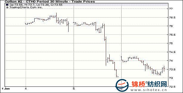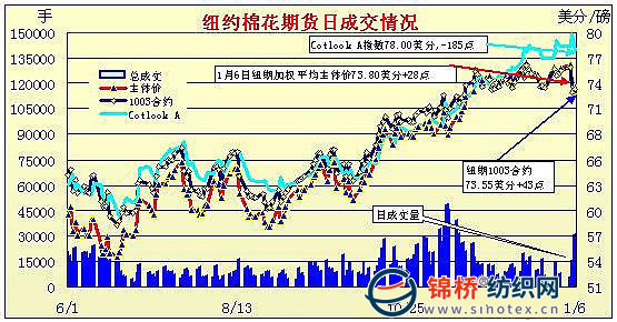 1月6日,美元沖高回落,原油繼續(xù)保持強(qiáng)勁上漲勢頭,紐約期棉在周二的大跌之后小幅反彈上漲,但反彈勢頭不強(qiáng),盤終3月主力合約漲43點(diǎn)收于73.55美分/磅,5月合約漲43點(diǎn)收于74.73美分/磅。當(dāng)日期棉開盤小幅沖高,在周二的暴跌之后買盤浮現(xiàn),推動(dòng)紐約期棉回升,盤中3月合約最高升至74.27美分/磅的位置,但午盤后漲幅回落,盤終收于73.55美分。整日交易,3月合約并未觸及周二的低位73.04美分/磅,顯示市場基本認(rèn)可73美分/磅的近期支撐位。同時(shí)從ICE公布的數(shù)據(jù)可知,在周二的暴跌中,近期3月合約大幅減持近8000張。 紐約棉花期貨首期1003合約近三個(gè)交易日交易走勢 |
